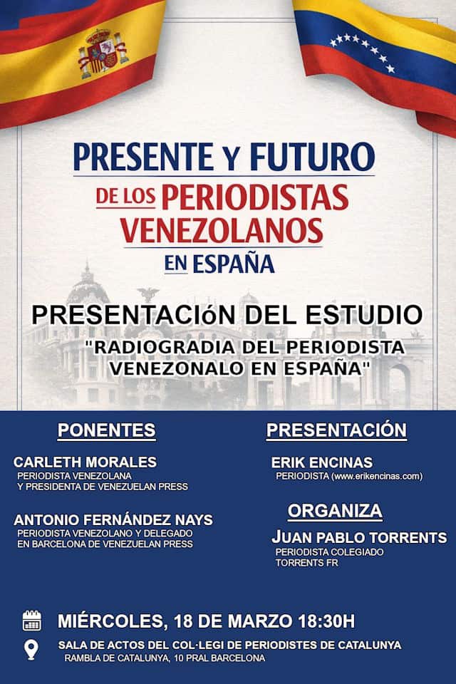 La conferencia contará con la participación de la presidenta de Venezuelan Press, Carleth Morales, y el periodista venezolano Antonio Fernández Nays, delegado de Venezuelan Press Barcelona. La presentación estará a cargo del periodista Erick Encinas.